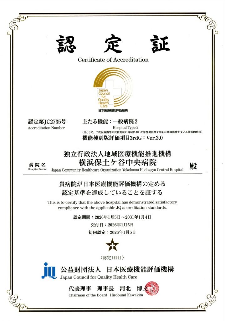 その結果、令和8年2月に「公益財団法人日本医療機能評価機構の定める認定基準(一般病院2 3rdG:Ver.3.0)を達成していることを証する」とした認定書を受領しました。